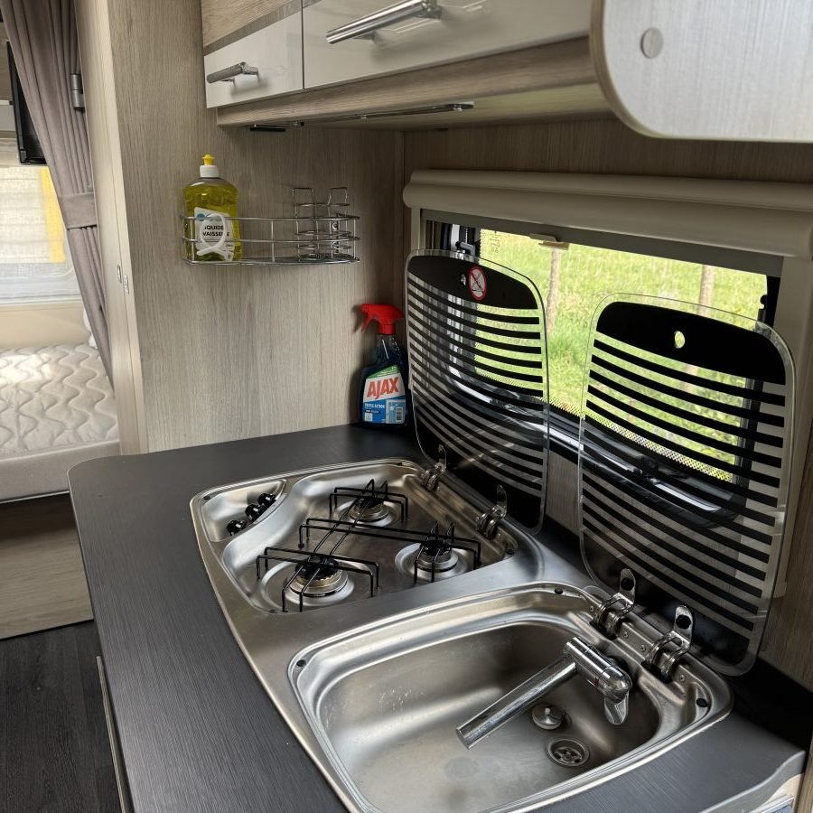 - Ausstattung: Kühlschrank, Warmwasser, Dusche, Toilette, zentrale Beleuchtung, Stockbetten, TV-Antenne, Frisch- und Abwassertank, Rangierhilfe, Ersatzrad, Gasherd