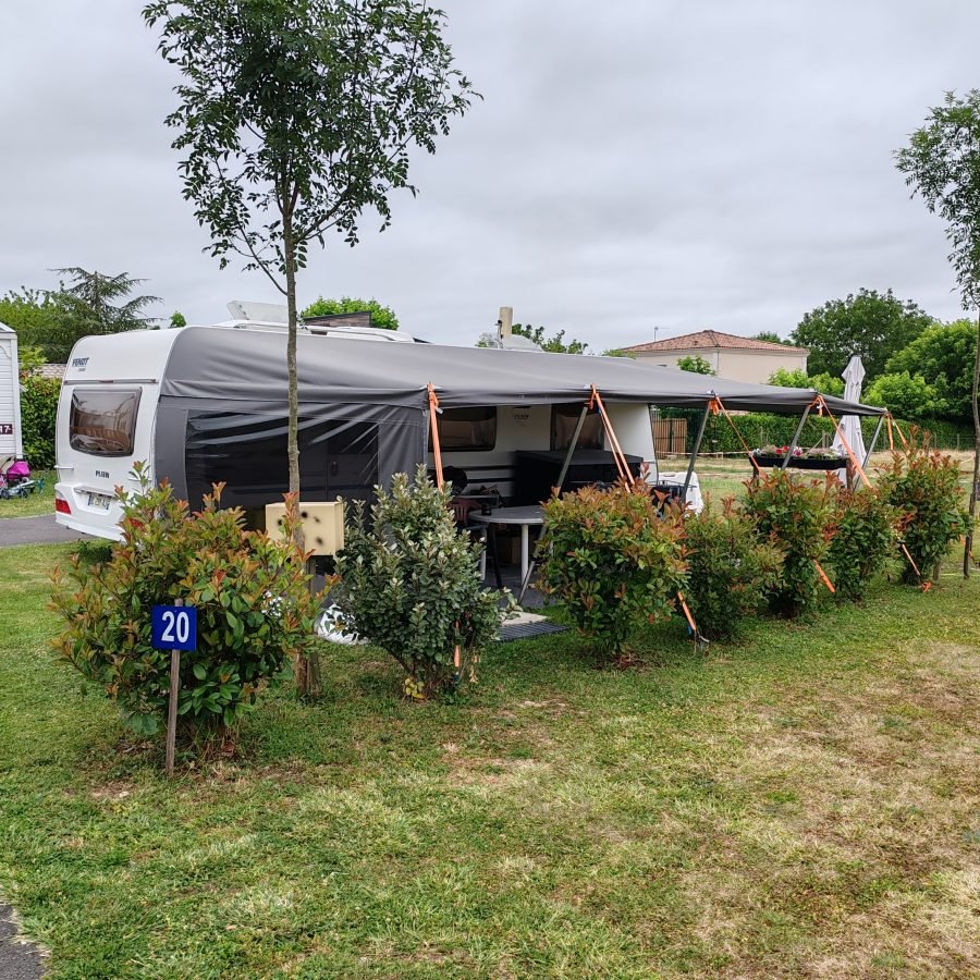 Der Wohnwagen ist für den stationären Einsatz vorbereitet und verfügt über Wasser- und Stromanschlüsse (EDF).