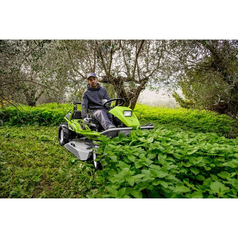 Débroussailleuse Autoportée Grillo Climber 10 AWD 22 4×4 Moteur V-Twin Briggs & Stratton 656ccLa débroussailleuse autoportée Grillo Climber 10 AWD 22 se distingue par son système de traction intégrale permanente 4×4, offrant des performances exceptionnelles sur pentes raides et terrains à faible adhérence. Motorisée par le Briggs & Stratton 7220 Professional Series V-Twin de 656 cm³, elle est équipée de la transmission hydrostatique Kanzaki avec blocage différentiel intégré sur l’essieu arrière. La hauteur de coupe se règle par levier assisté avec système de verrouillage dans toute position, actionné par vérin à air pour une course totale de 10 cm permettant de franchir aisément tous les obstacles.Caractéristiques TechniquesMoteur :Briggs & Stratton 7220 Professional Series V-Twin, cylindrée 656 cm³Carburant :EssenceDémarrage :ÉlectriqueBatterie :12VTransmission :Hydrostatique Kanzaki autopropulséeVitesse d’avancement :0 à 9 km/h en marche avant avec variation continue, 0 à 8 km/h en marche arrièreLargeur de coupe :93 cm avec porte-lames en acier spécial anti-bruitHauteur de coupe :35 à 135 mm avec réglage continu assisté par vérin à airSystème de coupe :Double éjection arrière et latérale, embrayage électromagnétique avec frein de lame intégré, couteaux escamotablesDifférentiel :Blocage sur essieu arrière, commandé par pédaleRoues motrices :4×4 permanentPneumatiques :Avant 4.00-8 profil agraire avec traitement anti-crevaison de série, arrière 20×10.00-8Capacité du réservoir :13 litresPoids :345 kgDimensions :206 x 103 x 118.5 cmRayon de braquage intérieur :70 cmInclinaison de pente maximale :22 degrésSurface maximale :10000 m²Accessoires de série :Crochet d’attelage et feu antérieur à LEDTechnologie et SécuritéLe système de traction intégrale permanente combiné à la transmission hydrostatique Kanzaki assure une motricité constante sur les quatre roues, garantissant sécurité et stabilité sur terrains difficiles. Les dimensions compactes optimisent les performances en pente tandis que le blocage différentiel sur essieu arrière renforce la traction dans les conditions les plus exigeantes. Le porte-lames en acier spécial intègre un dessin anti-bruit et des couteaux escamotables qui se rétractent automatiquement en cas de choc sur obstacle, préservant ainsi la mécanique. Le système de réglage de hauteur assisté par vérin à air permet un ajustement progressif et le franchissement d’obstacles grâce à une course verticale de 10 cm.Applications Professionnelles IntensivesLa Climber 10 AWD 22 est conçue pour les professionnels confrontés aux conditions les plus difficiles : débroussaillage de pentes raides, entretien de zones rustiques, agriculture en terrain vallonné et gestion d’espaces naturels accidentés. Sa capacité à couper l’herbe très haute et les arbustes jusqu’à 2,5 cm de diamètre en fait un outil polyvalent pour les collectivités territoriales, les entreprises de travaux forestiers, les exploitations agricoles en zone de montagne et les gestionnaires d’espaces naturels. Le rayon de braquage de 70 cm et la largeur de coupe de 93 cm offrent une productivité élevée sur surfaces jusqu’à 10000 m² tout en permettant de travailler efficacement dans les passages étroits et autour des obstacles.